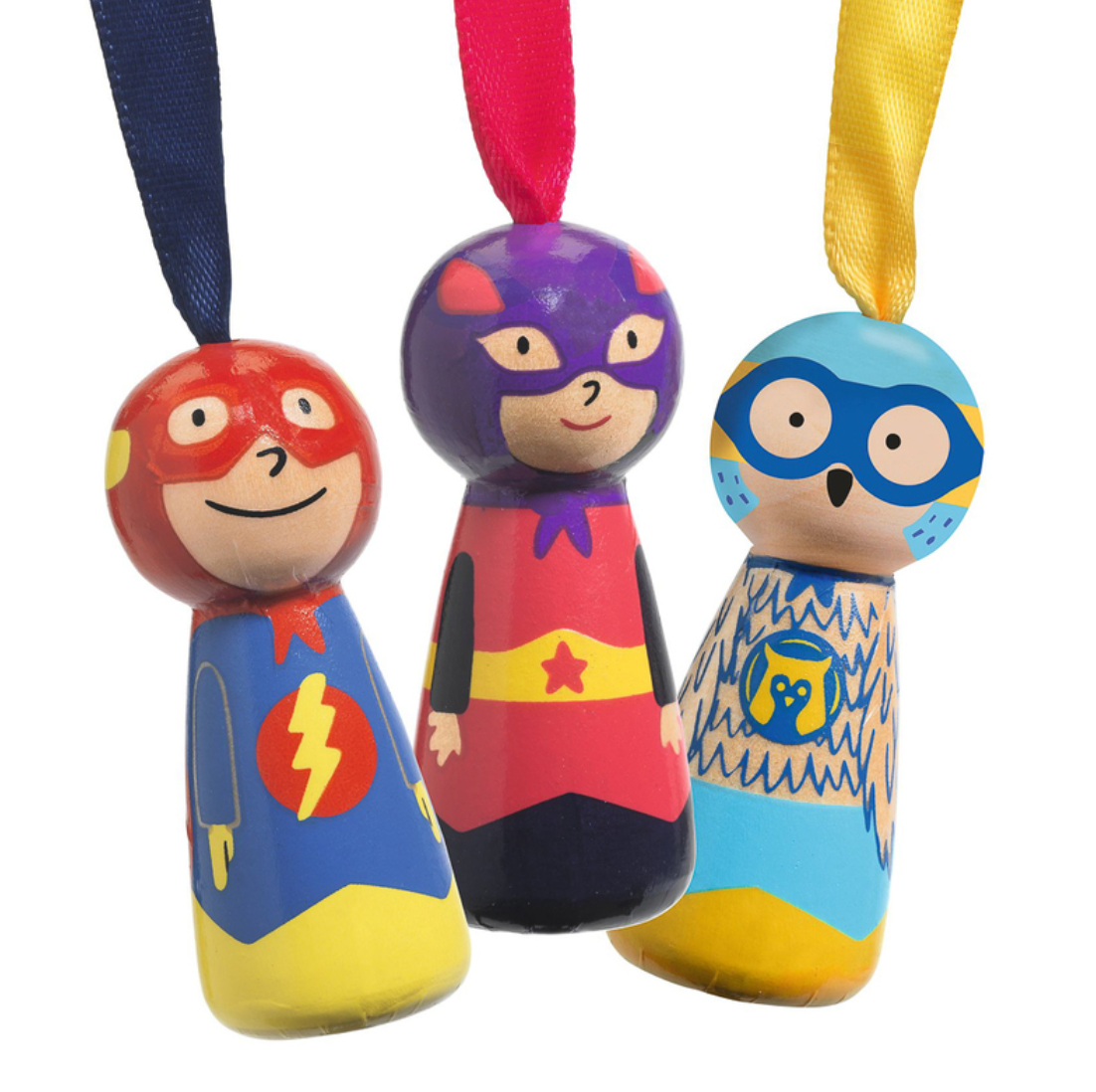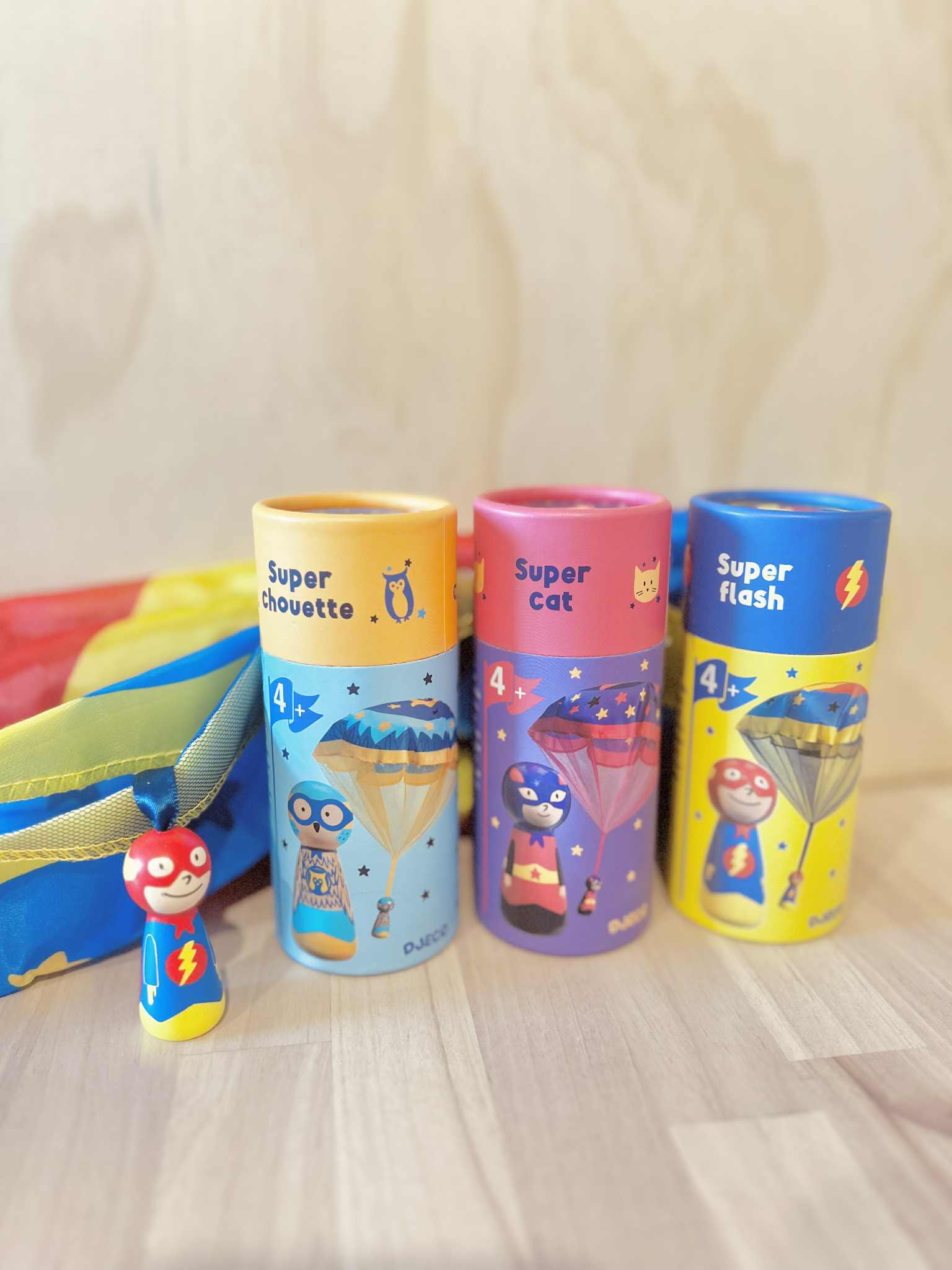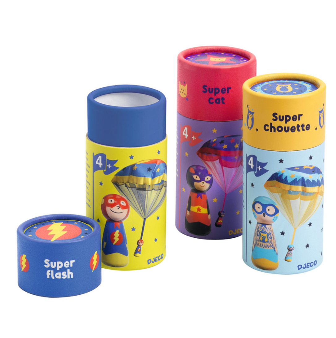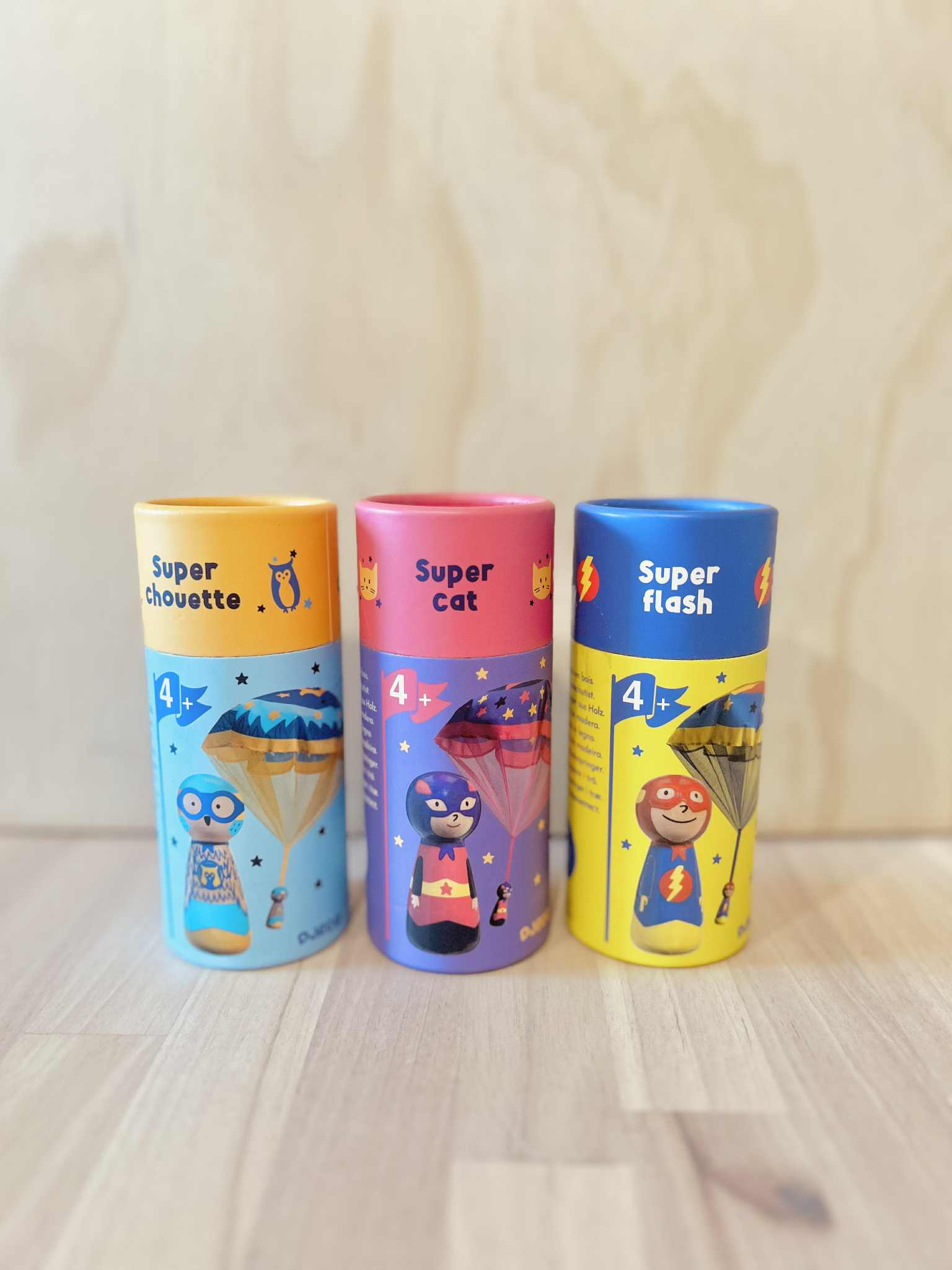 The Flying Heroes are little wooden hand-throwing parachutists: keep them in the air as long as possible! Super Flash, Super Cat and Super Chouette are each sold separately in lovely boxes. A modern take on a classic toy!