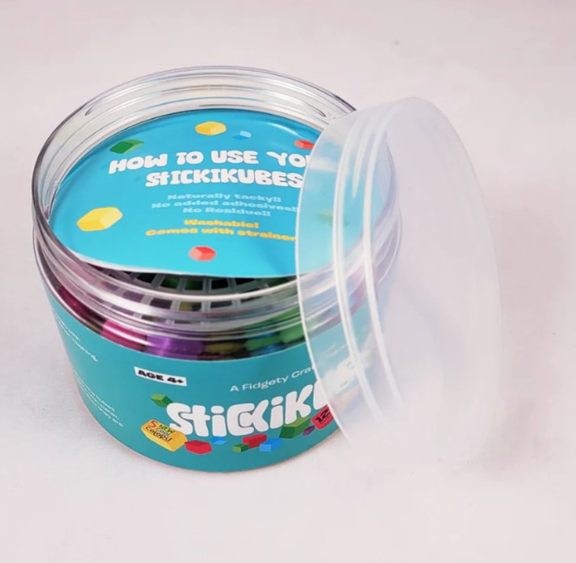 WHATS INSIDE: Includes 125 StickiKubes in 5 neon colours: Blue, Purple, Pink, Yellow and Green. Comes in a reusable plastic tub with built-in strainer for quick cleaning and easy storage.