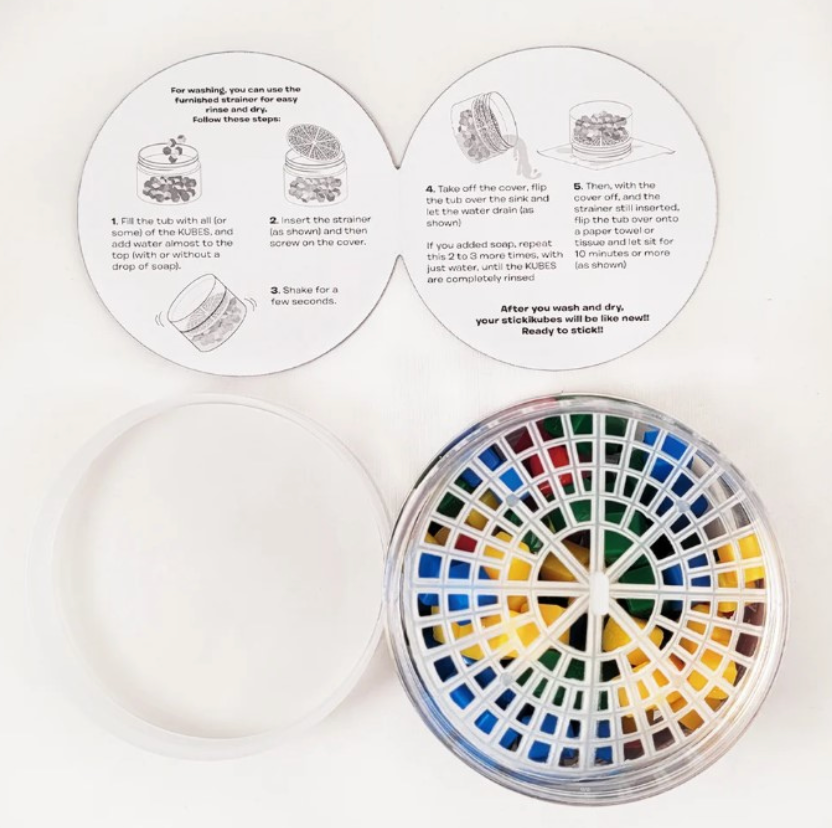 WHATS INSIDE: Includes 125 StickiKubes in 4 classic bright colours: Blue, Red, Yellow, and Green. Comes in a reusable plastic tub with built-in strainer for quick cleaning and easy storage.