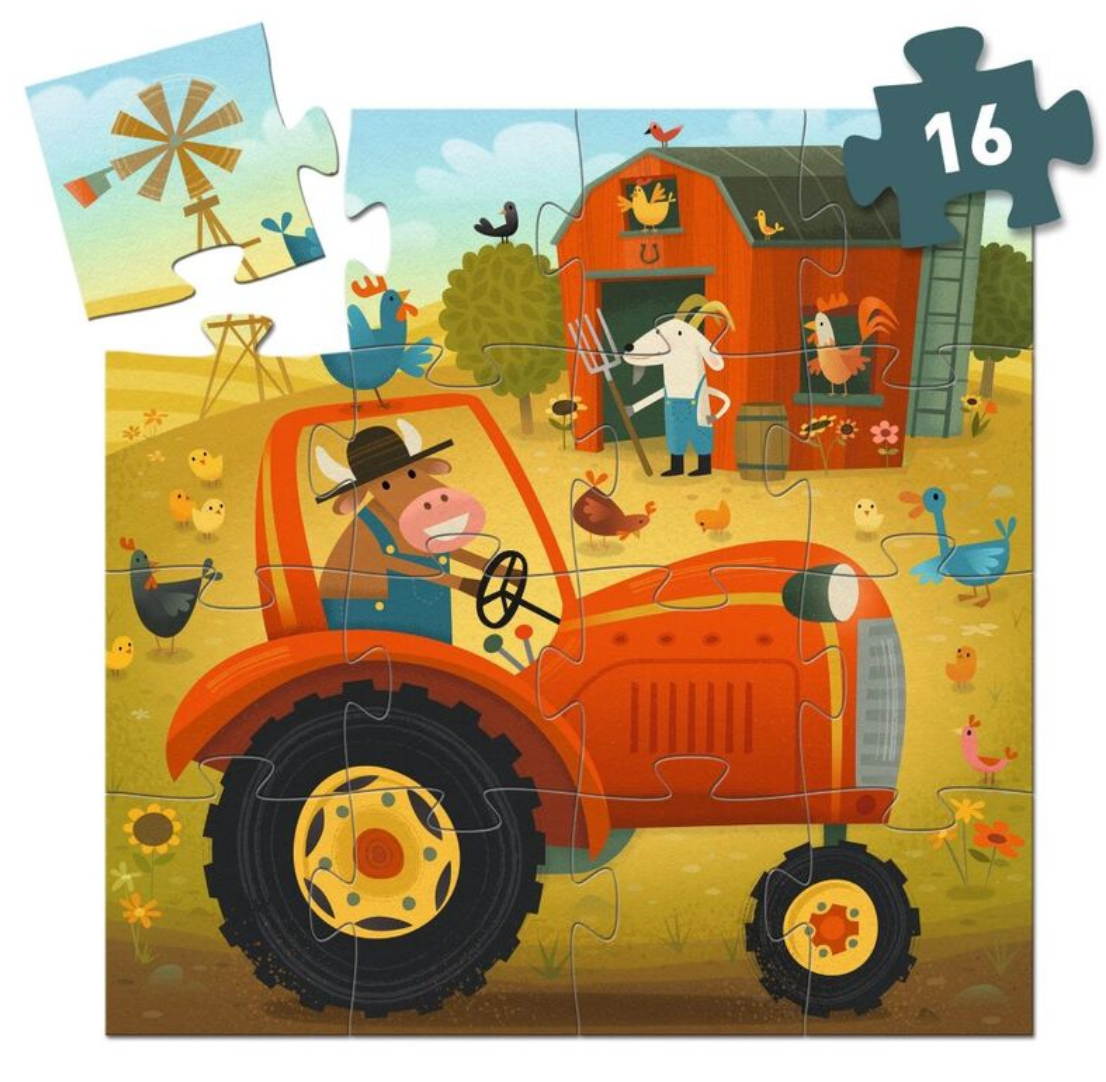 The tractor is back on the farm after a long day working in the fields. This colourful 16-piece puzzle comes in a lovely tractor-shaped box.